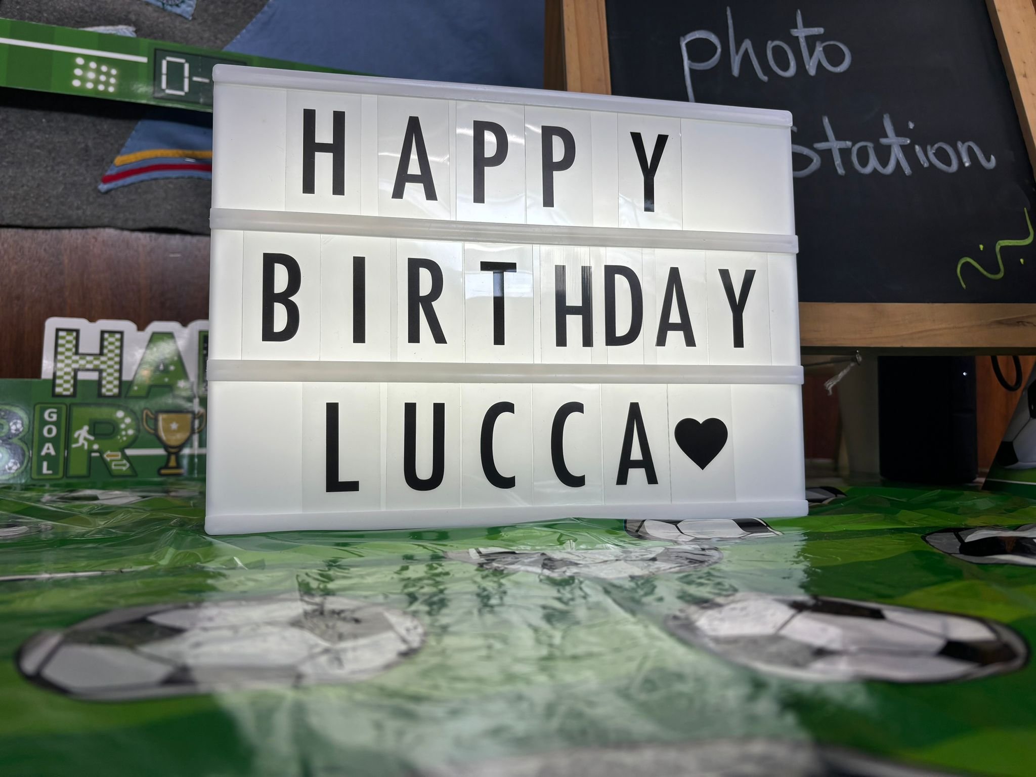 Soccer-themed backdrop and decorations